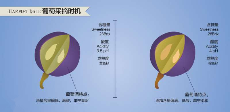 準確把握適宜的葡萄采摘時機是釀造一款優(yōu)質(zhì)葡萄酒的關(guān)鍵之一。葡萄采收得過早將令葡萄成熟度不夠,以致于葡萄酒的酸度過高,酒精度偏低,還會令其帶上更多的青澀水果的風味和香氣,單寧也更苦澀;而采收得過晚則會令葡萄酒的酸度偏低,酒精度偏高,單寧也偏少。采用過晚采收的葡萄釀造的葡萄酒風味往往過于肥膩平淡,酸度不夠,因此有時需要人工酸化的過程。另外,為了降低某些葡萄酒中偏高的酒精含量,有些釀酒師還會采取加水稀釋的工藝(Watering back),這就是那些廉價的商業(yè)性葡萄酒大多保持13.5%ABV的原因所在。
