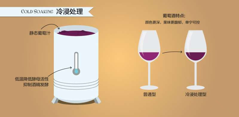 發(fā)酵時機的掌握也就是指冷浸處理(Cold soaking)和浸皮時間(Skin Contact)的控制,兩個概念都指的是葡萄皮與葡萄汁接觸的時長。通過將葡萄汁保持在低溫的環(huán)境下,抑制了葡萄汁中酵母被抑制了活性而阻止發(fā)酵過程,目的就是為了提取葡萄皮中的色素和果味,而與此同時,又可避免了萃取到苦澀的單寧。而在葡萄酒發(fā)酵中,我們將葡萄皮與葡萄酒接觸的整個過程稱之為浸皮(Skin Contact)。