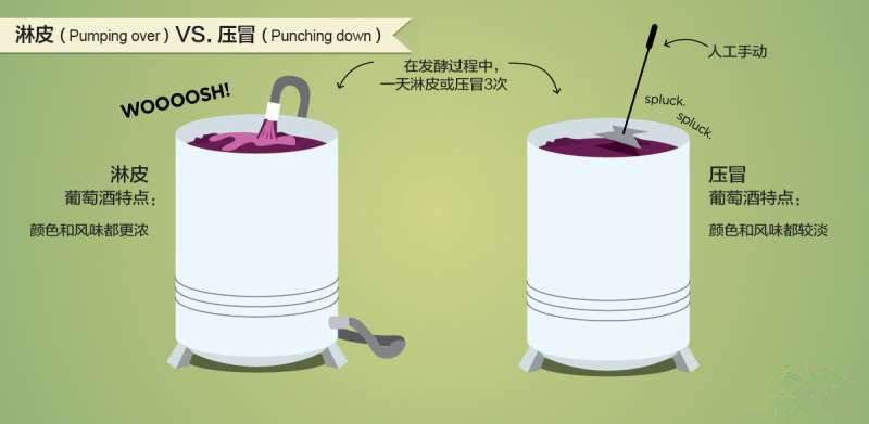 淋皮(Pumping over)能通過增加酒液也葡萄皮和葡萄籽接觸的機會來萃取更多的單寧,這在商業(yè)性釀酒中普遍存在,不過其缺點就是將過多的氧氣帶入到葡萄酒中。