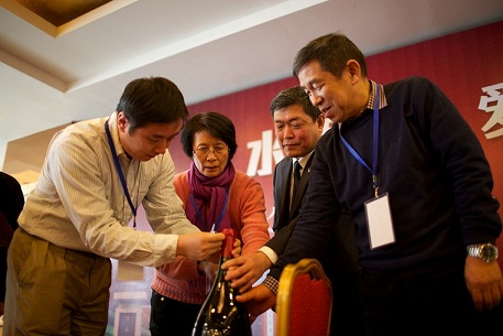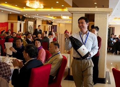 隆重的葡萄酒開瓶儀式將本屆年會推向高潮,上海交大副校長張安勝、山東校友會長秦建民、北美校友會長馬開桂、山東校友會副秘書長,冠威國際進出口經(jīng)理宋鵬共同開啟了“博若萊之王”——6升裝法國羅宏酒莊風車磨坊干紅葡萄酒。