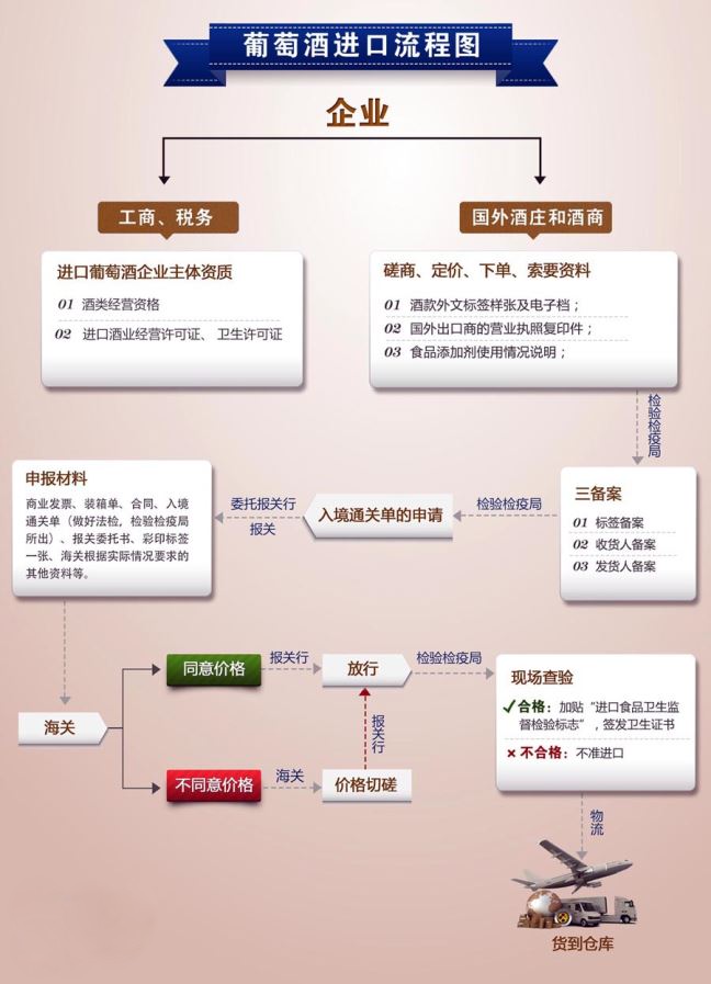 國內(nèi)的企業(yè)要從事進口葡萄酒的進出口和經(jīng)銷業(yè)務,除了辦妥一般經(jīng)營性企業(yè)的工商、稅務手續(xù)外,其企業(yè)營業(yè)執(zhí)照的營業(yè)范圍內(nèi)還應該包括酒類經(jīng)營資格,具備進口酒類經(jīng)營許可證和衛(wèi)生許可證。申請這類行政許可證書需要比較長的時間,需要提早做好準備,否則即使國外酒莊準備好了貨物也無法進口。