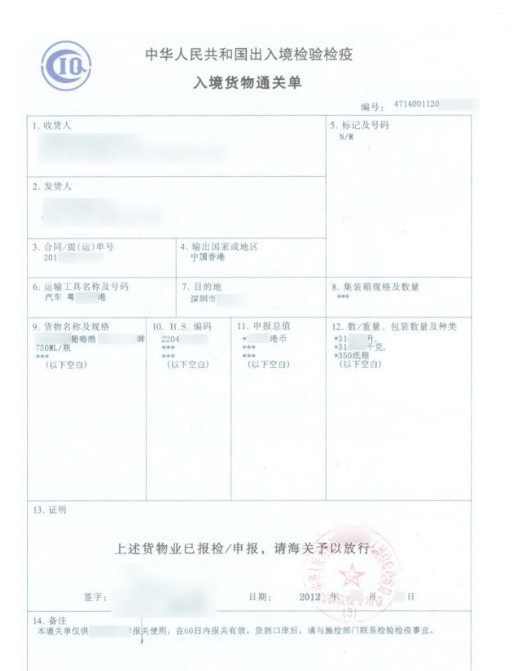 四、入境通關單的申請無論是通過陸地口岸還是海運口岸,貨物都必須具有入境通關單才能夠進行報關。申請通關單時需要向檢驗檢疫局提交的資料包括之前備案好的酒標復印件,原產(chǎn)地證,發(fā)票、裝箱單、購銷合同復印件以及查貨清單等。注意通關單的有效期為90天,因此通關單的申請可以在貨物到達口岸的前幾天申請,以免提前申請后過期。