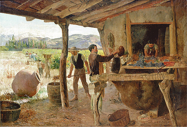 《庫(kù)里科山谷葡萄豐收?qǐng)D》由智利著名畫家Alberto Valenzuela Llanos繪于1098年,油畫描繪了當(dāng)時(shí)的智利酒農(nóng)們勞作的場(chǎng)景。