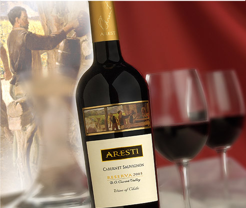 1953年,阿雷斯帝酒莊創(chuàng)建之初,文森特·阿雷斯帝·阿斯帝卡(Vicente Aresti Astica)正在為新酒莊的酒標(biāo)設(shè)計(jì)而煩惱。一次偶然的機(jī)會(huì),他在拍賣會(huì)上偶然看到了一副油畫,油畫上描述了半個(gè)世紀(jì)以前智利酒農(nóng)們收獲葡萄,釀造葡萄酒的場(chǎng)景:遠(yuǎn)處是連綿的群山,山腳下是廣闊的葡萄園,酒農(nóng)們正在采摘葡萄,近處的釀酒師正在把剛剛收獲的葡萄進(jìn)行篩選,破碎,然后裝進(jìn)陶罐和橡木桶里進(jìn)行發(fā)酵。