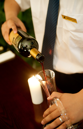 醒酒的時(shí)間從幾十分鐘到幾個(gè)小時(shí)甚至幾十個(gè)小時(shí)不等。醒酒可以使一款年輕的葡萄酒變得圓潤(rùn)與柔順,使它喝到口中舒服愉悅。但是如果時(shí)間把握不好,醒酒時(shí)間過(guò)長(zhǎng)很有可能使酒失去它的新鮮清爽的味道,失去活力。對(duì)于年老的葡萄酒來(lái)說(shuō),醒酒要特別小心,稍有不慎就有可能使它失去酒中珍貴的香氣而殺死一款價(jià)格不菲的好酒。也不能忘記當(dāng)把酒從醒酒器倒入酒杯的同時(shí),會(huì)加速氧化作用,所以要特別小心。甚至對(duì)于有年份的老酒,飲用時(shí)一定要傾斜酒杯,使酒沿著酒杯壁緩緩倒入。