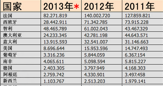 中國海關的數(shù)據顯示,在外國進口葡萄酒方面,法國酒占據了進口葡萄酒數(shù)量的50%,遠超澳大利亞(13%)和西班牙(11%),法國葡萄酒的數(shù)量一直在增加。西班牙葡萄酒正在發(fā)展當中,2013年上半年的銷量,與去年同期相比,增加了40%,西班牙現(xiàn)在是中國第三大葡萄酒出口國。