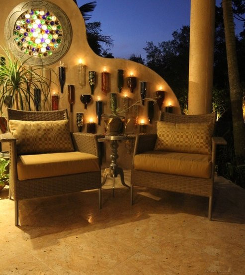 設(shè)計師將這些酒瓶切割成一半,并使用一種粘性非常大的膠水將其粘貼在墻上。上方五光十色的圖案由彩色玻璃拼湊而成,在夜色和燈光的映襯下,這面墻壁顯得尤為生動美麗。
