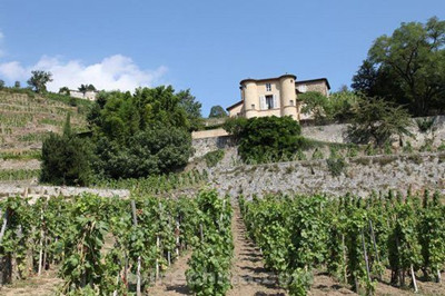 爬坡用了半個小時,走到了山頂,不時有車快速向山頂開去,其中有些是來干活的果農。爬葡萄園時,有些路段比較陡峭,差不多有45度的斜坡,下山時更要小心,最好是側著身體, 否則不小心就會“坐滑梯”或是前滾到第二站——格里葉堡(Chateaux-Grillet),羅訥河畔的明珠。